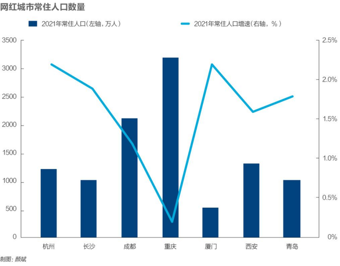 七座网红城市除厦门外,均为常住人口超1000万人的超大城市。2021年,厦门常住人口为528万人。重庆作为直辖市,也是七座城市人口最多的市,2021年常住人口达到3212万人。成都仅次于重庆,2021年常住人口为2119万人。同年,西安、杭州、青岛、长沙的常住人口分别为1316万人、1220万人、1026万人、1024万人。