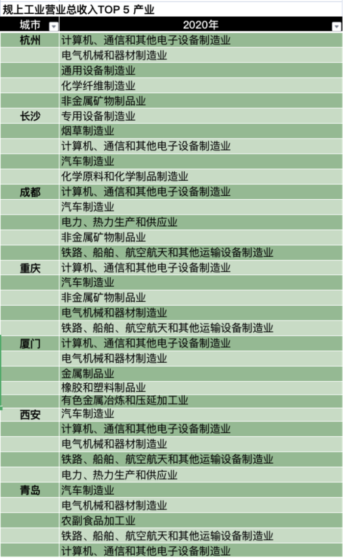 七座城市都有各自的标杆产业。梳理2020年的规上工业营业总收入TOP 5产业,杭州、成都、重庆、厦门、西安的计算机、通信和其他电子设备制造业较为突出,均有代表性互联网企业落地。诸如厦门有美图、美柚、4399、吉比特、美亚柏科等企业。除此之外,长沙、成都、重庆、西安、青岛的汽车制造业均较为突出。诸如成都有一汽大众、沃尔沃、四川一汽丰田等工厂;西安有陕汽、比亚迪、吉利等车企;青岛则坐拥一汽解放、上汽通用五菱、一汽-大众等企业。长沙的专用设备制造业、烟草制造业突出,中联重工、三一重工、湖南中烟等是龙头企业。