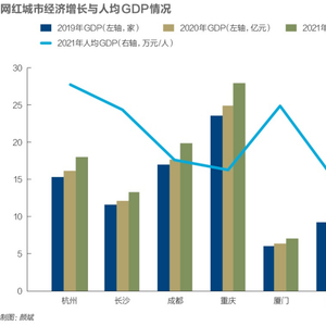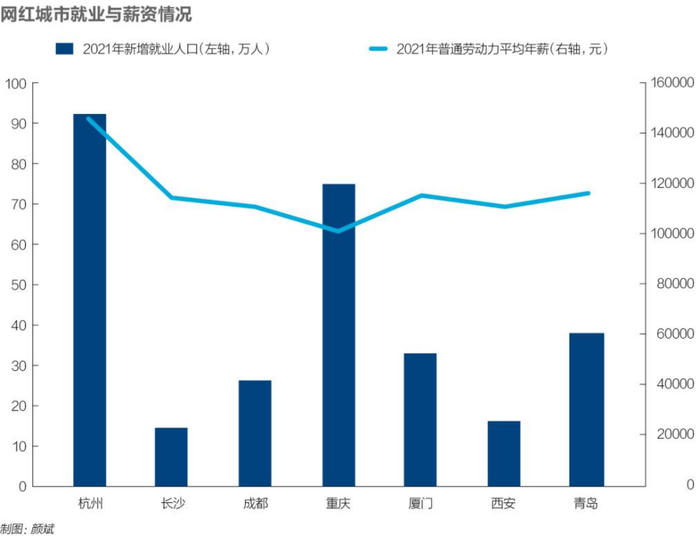 以产业结构看,七座城市中,重庆的农业占比相对多,厦门的农业占比几乎可忽略不计,2021年第一产业占比分别为6.9%、0.4%。厦门、重庆、长沙的工业占比偏高,2021年第二产业占比分别为41%、40.1%、39.6%。杭州、成都的工业占比偏少,服务业相对更蓬勃,前者分别为30.3%、30.7%,后者分别为67.9%、66.4%。相较而言,重庆是七座城市中服务业占比最少的网红城市,第三产业占比为53%。