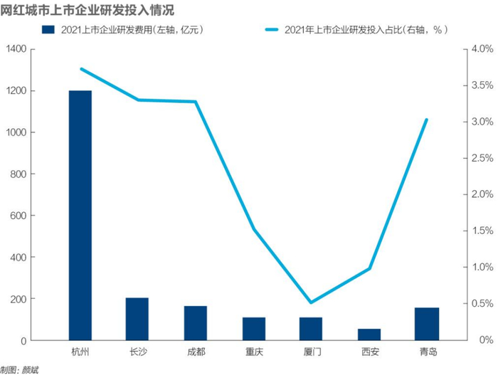按上市企业研发投入费用、占比排名,杭州均位列第一,2021年投入1205亿元,投入费用远远甩开其他城市,研发投入占比为3.73%。长沙、成都、青岛、重庆、厦门、西安,2021年研发投入费用分别是204亿元、168亿元、158亿元、113亿元、111亿元、58亿元;同期,重庆、西安、厦门的研发投入占比在2%以下。