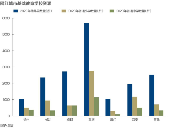 重庆是基础教育学校最丰富的城市,杭州、厦门的基础教育学校相对更少。2020年,重庆基础教育学校总计9590所,同年,杭州仅1916所、厦门1439所,而成都有3990所,长沙、西安、青岛均在3600所左右。分阶段看,2020年,重庆、成都、青岛、长沙的幼儿园数量均在2000所以上,而杭州、厦门幼儿园数量均是1000所出头。2020年,重庆、西安的普通小学数量均在1000所以上,杭州、厦门的普通小学不及500所。2020年,重庆、成都的普通中学数量均在600所以上,杭州、长沙、青岛均为300多所,厦门为111所。考虑到杭州常住人口数量约为厦门的一倍,不考虑教学质量,总体上,小孩在杭州上学的资源相对紧缺。