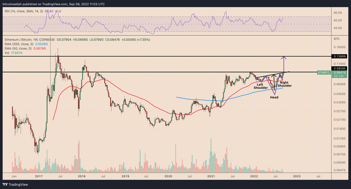 具有“反向头肩”突破设置的 ETH/BTC 每周价格图表。资料来源:TradingView