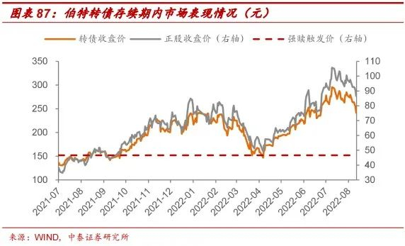 伯特转债自上市后就与正股保持了较高的协同性,2021年公司智能化积极推进汽车智能化产品,正股及转债得到市场青睐,于2022年1月25日首次触发强赎条款,公司公告不提前赎回,而后2022年4月公司公告收购万达汽车方向机股份有限公司45%股权,正股价格在强赎线附近强势反弹,于2022年8月15日再次触发强赎条款,公司第二次公告不提前赎回。