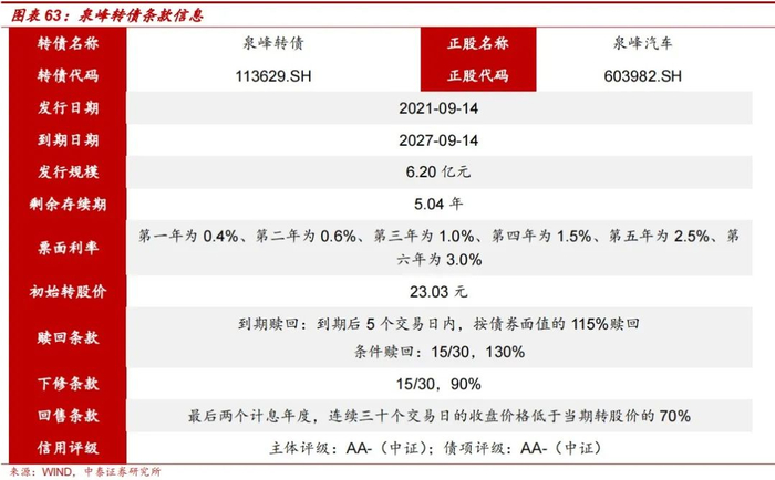 拓普转债于2022年7月14日发行,存续期为6年,截至8月31日,剩余存续期5.87年,发行规模为25.00亿元,在汽车行业转债中发行规模较大。拓普转债中证主体及债项评级均为AA+,整体信用评级较高,票面利率方面,第一年到第六年的利率分别为0.2%/0.4%/0.6%/1.5%/1.8%/2.0%,最后到期按面值的110%赎回。