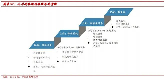 1)基础发展底线:油车的热管理系统、转向与刹车系统、引擎系统是公司业务发展基石,而传统内燃机相关业务将逐步退出,为新兴业务释放资源。2)增长基础线:扩大现有传动系统核心产品的市场份额,尤其是要抓住国产替代的机遇,将自动变速箱领域的相关产品,在未来3年,力争实现倍数级增长。3)爆发增长点:针对下一代动力总成发展趋势,公司将在新材料、新工艺以及创新性模组、系统总成以及压铸一体化方向大幅度投入资源,争取实现业务的指数级增长。