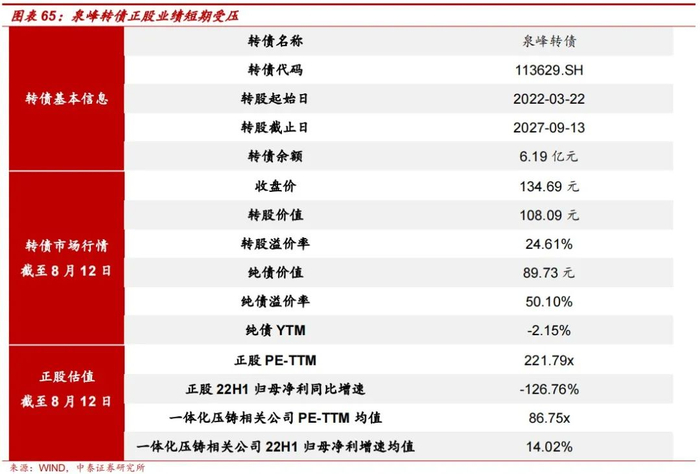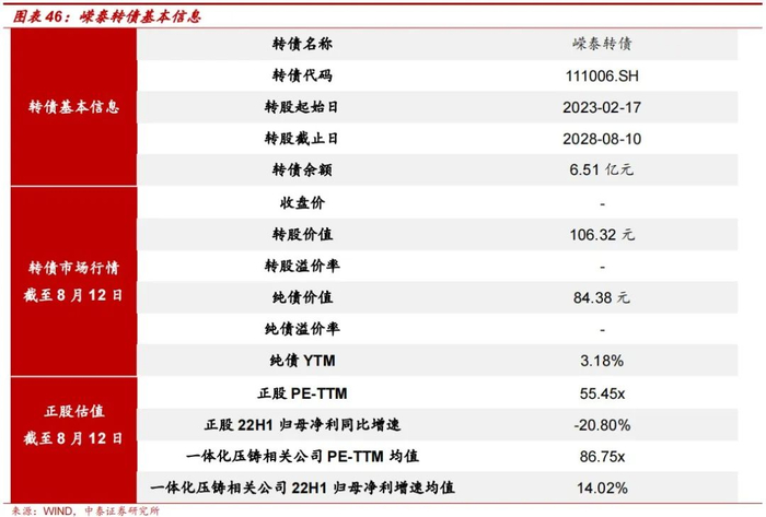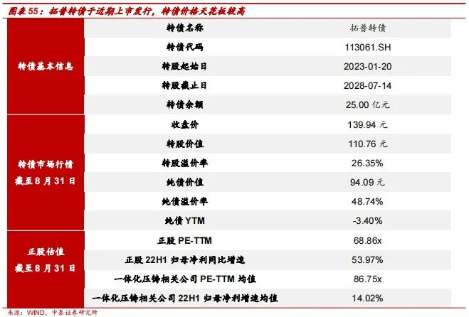 拓普转债刚于8月22日上市发行,横向对比赛道内头部企业估值,拓普转债正股估值仍较低。2021年年底公司同时切入一体化压铸及汽车热管理系统赛道;一体化压铸方面,公司已与十余家海内外主流的传统及新能源车企厂商达成在一体化压铸后舱总成和轻量化底盘系统方面的深度合作;热管理系统方面,公司依托自身产品优势,自研出各类热管理系统部件,并实现产品向多家大型车企批量供货;我们看好这两大优质赛道对公司未来营收及业绩的长期高质量驱动。横向对比一体化赛道内的文灿转债正股,两家公司均已实现一体化压铸设备阶段性落地和产品量产,而文灿转债正股PE-TTM达到125.33x,拓普转债正股估值仍有望更上一层楼,从而带动正股及转债价格更上一层楼。