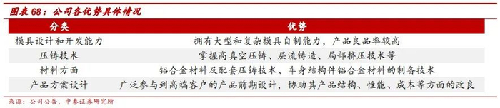 模具设计和开发能力优势:公司所有车身结构件项目的模具都是自主开发制造的,子公司文灿模具积累了大量车身结构件的项目经验,也是国内少数拥有大型和复杂模具自制能力的汽车铝合金压铸企业,通过10年的产品开发和生产,在车身结构件产品领域公司产品的良品率平均都能达到90%-95%以上。