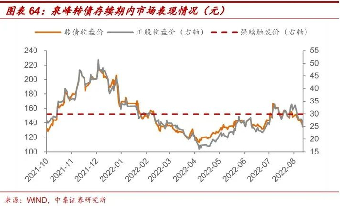 泉峰转债于2021年10月21日上市后,正股走势保持着较高的联动性。2022年8月22日,泉峰转债触发强赎条款,公司考虑到剩余存续期仍有5.06年,以及正股股权较高的质押比例,公告不提前赎回,截至8月31日收盘,泉峰转债已回落至强赎价格以下。