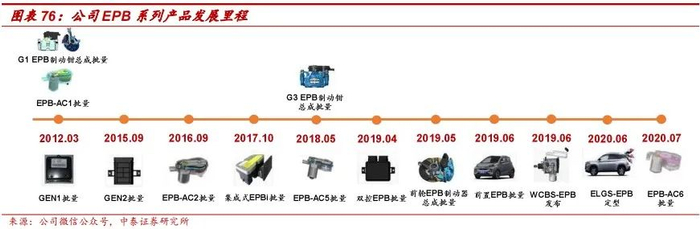 公司首个EPB客户项目于2012年量产,是国内首家、全球第二家实现EPB量产的零部件供应商。2020年7月,EPB产品第100个项目量产,从立项到1000个项目投产,公司经历了10余年的奋斗,开发出了15余个极具竞争力的EPB相关产品,产品具有快速智能控制策略、快速开发能力、能够提高驾驶舒适度的能力以及更高的安全性。