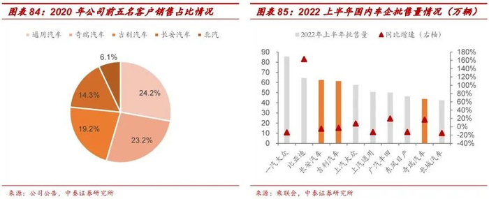 2020年公司前五大客户分别为通用汽车(占比24.2%)、奇瑞汽车(占比23.2%)、吉利汽车(19.2%)、长安汽车(占比14.3%)以及北汽(占比6.1%)。奇瑞汽车、吉利汽车及长安汽车分别进入2022年上半年国内汽车批售量前十名,其中于公司深度绑定的奇瑞汽车上半年批售量增速亮眼达到17.2%,长安汽车及吉利汽车上半年批售量跌幅不大,分别为-4.6%和-2.6%,2022年公司营收及业绩仍有望维持增长。