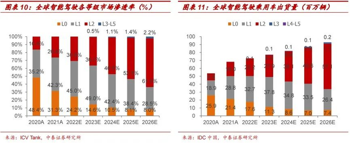 L2级智能驾驶仍将为未来智能驾驶汽车行业主要市场。据ICV Tank数据,截至2021年,L0及L1全球汽车市场占比分别达31.3%和42.3%,为当前全球汽车市场主流,智能化驾驶水平较低;L2为未来主要发展趋势,IDC中国预计到2026年L2全球汽车市场占比将达到61.5%,全球出货量预计将达到5710.8万辆,5年CAGR达到26.6%。