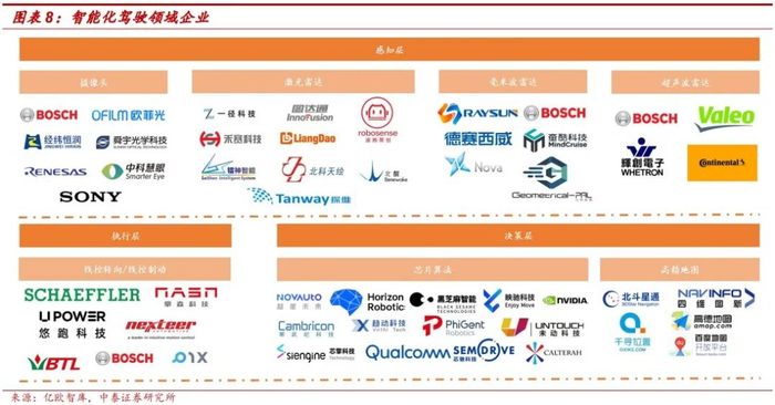 实现智能化驾驶需解决三个维度,主要包括感知层、决策层和执行层。感知层的核心是传感器,由其完成对外部环境信息的识别,主要包括摄像头、激光雷达及毫米波雷达等传感器;决策层算法承担承上启下作用,对感知端信息实时分析,将有用的外界信息转化成为执行指令,芯片算法是否强大决定了决策层的工作效率;执行层根据指令做出相应的操作,实现自动驾驶,主要包括线控转向及线控制动。