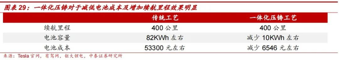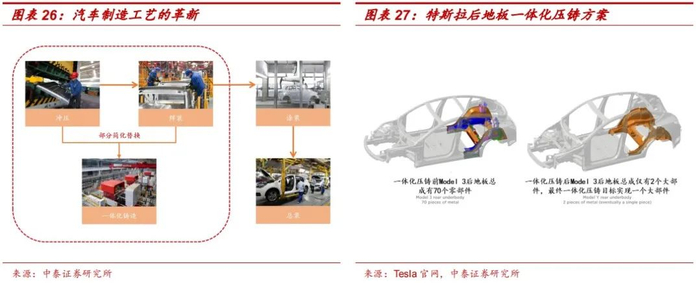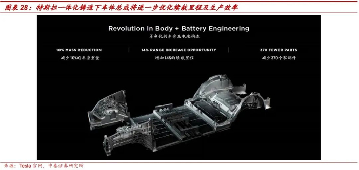 特斯拉引领一体化压铸风潮,是对传统压铸技术的革新。传统的车身制造主要分为四大工艺,分别为冲压、焊装、喷涂以及总装,而一体化铸造简化了冲压及焊装环节,进一步增加了车身生产效率。在2020年9月的特斯拉电池日,特斯拉宣布将在Model Y车型的生产制造中使用一体压铸后地板总成,该项生产变革将使得相应生产零部件减少79个;同时,如图28所示,特斯拉还计划在未来实现一体化铸造下车体总成,目标将370个零件极限压缩至2-3个大铸件,将续航里程增加14%;特斯拉对于传统压铸技术的激进创新及改革,标志着大型单体铸造零件拼装整车的设计思路正式落地。