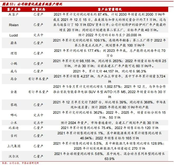 汽车后置仓一体化压铸方面,2022年2月,公司首台7200T压铸机下线,该压铸机将主要用于为华人运通高合汽车生产一体化后舱总成,将达到15%~20%的汽车后舱减重效果。轻量化底盘系统方面,公司已与国内外主流传统及新能源车企形成了优质客户群,并已获取其量产订单,其新增的订单需求亦处于不断释放阶段;此外,根据图表38所示,公司轻量化底盘系统客户2021年销量增长迅猛,未来各车企产能及销量仍将持续增加。