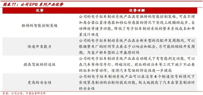 · 公司EPB系列产品技术优势明显,是国产替代化的“排头兵”