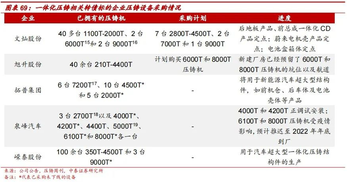 各企业迅速布局大型化压铸,文灿股份先发优势明显。2021-2022年各企业通过购买大型压铸设备进入积极布局大型化、一体化压铸。其中文灿股份及拓普集团取得一定明显的先发优势,文灿股份采购的6000T和9000T压铸设备已分别于2021年11月和2022年4月下线实现量产,并以获得多家企业多个项目的定点;截至2022年上半年报发布,公司已经获得大型一体化结构件后地板项目、前总成项目、上车身一体化项目的定点,在大型一体化结构件产品领域位于行业前列,引领行业发展。