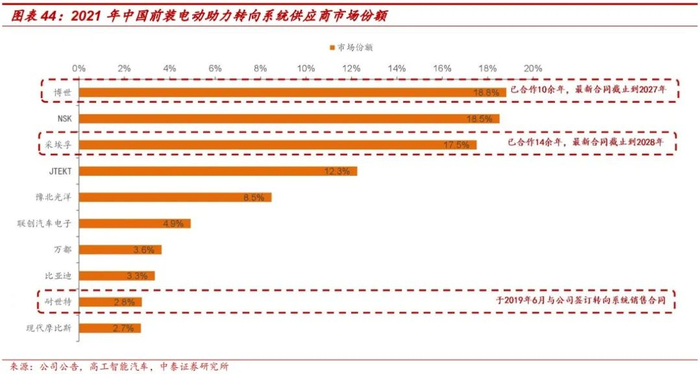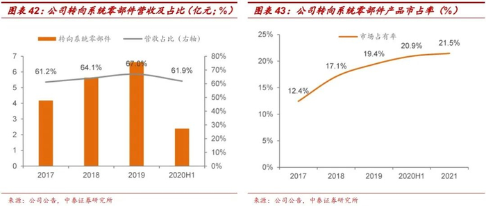 转向系统零部件为公司主要产品,2020年上半年实现营业收入2.40亿元,占总营收的61.9%,并且更值得关注的是,自2017年公司转向系统零部件产品市场占有率逐年提升,其2021年市场占有率达到21.5%。此外,公司转向零部件产品已与博世、蒂森克虏伯、采埃孚、耐世特等厂商建立了长期合作关系,也已于上述四家公司签订了较长的销售合约;考虑到博世及采埃孚在国内电动助力转向系统领域绝对的主导地位,公司未来核心业务营收具有较强的支撑。