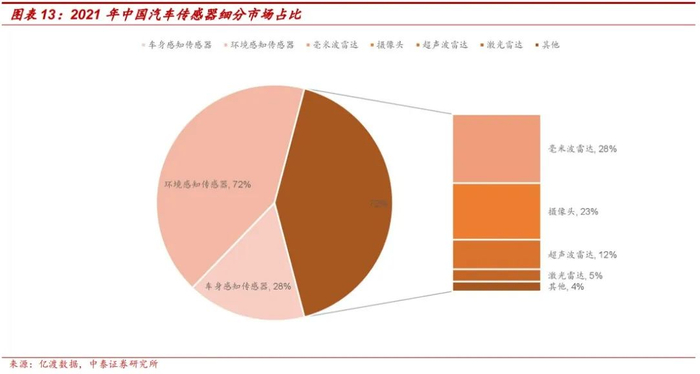 智能化加速,环境感知传感器占比提升。汽车传感器可分为车身感知传感器和环境感知传感器;车身感知传感器主要用于获取汽车车身信息的基础传感器;环境感知传感器指通过采集、输出汽车周围环境信息以协助汽车实现智能驾驶的汽车传感器。2021年,中国汽车传感器市场中,车身感知传感器技术较为成熟,市场占比为28%;随着自动驾驶技术的发展,环境感知传感器(摄像头、雷达等)需求增大,市场占比为72%。