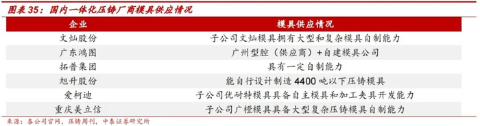 · 模具:Tier1压铸厂商重视大型模具对一体化压铸生产的配套