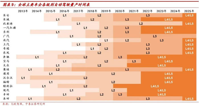 传统车企稳健打法,新势力造车激进研发。从全球车企自动驾驶量产时间表可以看到,当前正处于车企密集研发L3级自动驾驶的阶段,一般自动驾驶先在高端旗舰车型上搭载,渗透到品牌内主流车型仍需要一段时间。目前以特斯拉、小鹏、蔚来为代表的新势力造车企业表现相对激进,主打L3 级自动驾驶,而国内外传统车企表现相对稳健,优先稳健布局L2 级别自动驾驶。