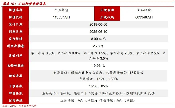 文灿转债于2019年6月6日发行,存续期为6年,截至8月31日,剩余存续期2.78年,发行规模为8.00亿元,属于小盘转债。文灿转债中证主体及债项评级均为AA-,整体信用评级偏低,而票面利率方面,第一年到第六年的利率分别为0.5%/0.8%/1.2%/2.0%/2.5%/3.5%,最后到期按面值的115%赎回。