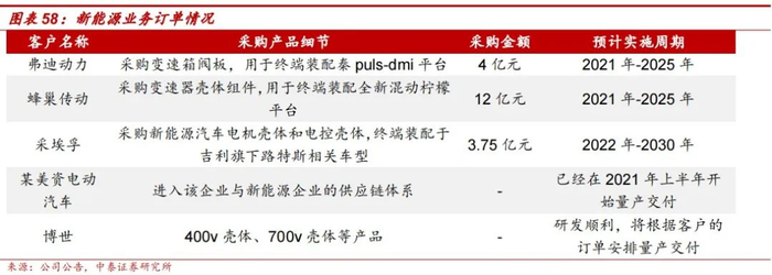 据公司半年报披露,2022年上半年公司新能源相关业务采购合同总额超过19.75亿元,是2021年新能源零部件营收的6倍之多。截至2022年半年报,公司已公开披露的新能源业务订单包括:比亚迪秦puls-dmi平台配套的采购变速箱阀板;蜂巢传动全新混动柠檬平台配套的变速器壳体组件;采埃孚为终端吉利路特斯相关车型配套所需的电机壳体和电控壳体;某美资供应链体系所需配套产品;为博世氢燃料系统供应的400v壳体、700v壳体等产品;采购合同总额超过19.75亿元。