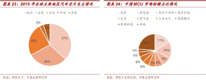 汽车芯片是指用于车体汽车电子控制装置和车载汽车电子控制装置的半导体产品。汽车芯片大致可以分为:主控芯片、MCU功能芯片、功率芯片、存储芯片、通信芯片及其他芯片(传感芯片为主)六大类。目前我国汽车芯片进口依赖度高达95%左右,其中瑞萨在我国MCU产品市场占比最高达到17%,而我国在各类芯片领域的自主设计及生产能力较差,2019年我国芯片产业自主率仅为3%。