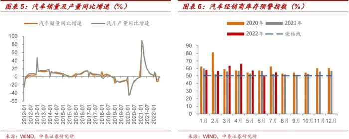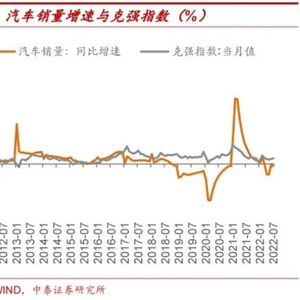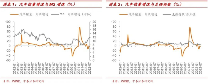 汽车行业具有一定周期性,M2增速及克强指数对汽车销量具有前瞻预测性。M2代表着广义货币供应量,是指流通交易货币以及定期存款与储蓄存款,通常反映的是现实及潜在购买能力。克强指数主要通过工业用电量新增、铁路货运量新增和银行中长期贷款新增,这三大指标评估中国GDP增长量。截至2022年7月,M2及克强指数逐步企稳上扬;4月至7月期间M2维持10.5%以上增速,克强指数维持稳定增长,保持在5%-7%之间,但值得注意的是,7月国内社融数据低于预期,与M2呈现背离,证明市场投资热情仍然疲软,汽车销量得到提振并从底部反弹恢复预计将是一个漫长的过程。