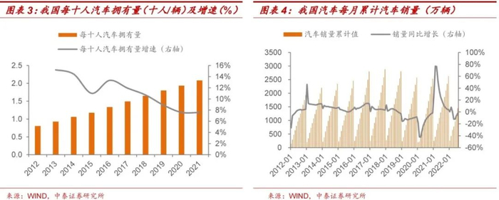 受疫情影响,2022年上半年汽车销量受压。2022年1月至7月,汽车销量分别为251.3万辆、175.5万辆、224.1万辆、118.2万辆、186.4万辆、250.2万辆和242.0万辆。其中,3月至5月单月销量同比增速为负;保有量方面,2021年我国每十人拥有2.08辆汽车,同比增长为7.56%,连续3年增速维持在10%以下;从产业周期看,我国汽车产业将逐步进入普及阶段后期,行业增长逐渐稳定,从增量市场转入存量市场。