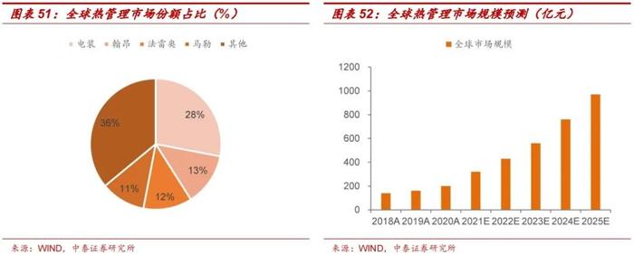 海外主导,国产替代未来可期。目前热管理领域由海外巨头电装、翰昂、法雷奥和马勒主导,CR4达到64%,同时该些企业产品布局也相对完善。而国内自主零部件供应商通过技术积累和自身优势单品,如拓普依托汽车电子领域的深厚积淀,在智能刹车系统IBS的技术的基础上横向拓展开发出热泵系统、电子水泵、电子膨胀阀等热管理系统产品,并实现产品向多家大型车企批量供货。汽车热管理系统市场规模目前处于快速增长阶段,到2025年中国汽车热管理市场规模将达到401亿元,同时预计带动公司汽车热管理系列产品营收快速增长。