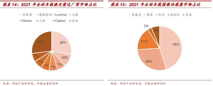 国外厂商主导各类环境感知传感器市场,较高集中度筑起市场壁垒。2021年车载激光雷达、车载图像传感器及车载毫米波雷达的市场集中度都较高,CR3分别达到45%/91%/47%,并且各领域主导品牌均来自于国外厂商,给国产品牌“开疆扩土”带来了较大的市场阻力。