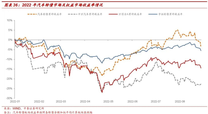 相较于权益市场,汽车转债整体收益率高18.9pcts,波动性低4.6pcts,攻防兼备。2022年国内疫情反复致使下游汽车消费疲软,芯片危机延续和原材料上涨导致行业生产成本不断上升。截至8月31日汽车行业权益市场跑输万得全A指数8.2%。反观转债市场,收益率明显高于权益市场,如汽车权益市场2022年最低收益率为-26.7%,而汽车转债市场最低收益率为-18.5%,抗跌属性凸显。截至8月31日收盘,申万汽车板块及汽车转债板块收益率分别为-22.7%/-3.8%,波动率分别为5.8%/1.2%,汽车转债收益能力及风险防御能力都表现出色。