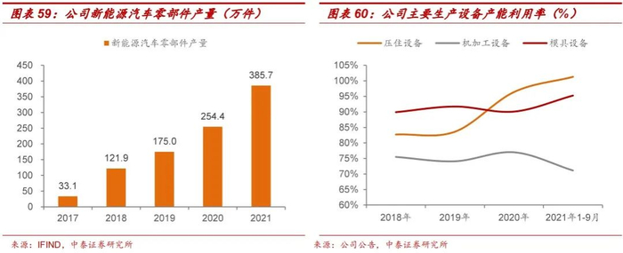积极布局新能源零部件产能扩张,产能边际提升打开新能源业务增长空间。自2017年开始,公司新能源零部件产量快速提升,同时公司主要设备均处于较为饱和的生产状态。压铸设备和模具设备的产能利用率基本维持在80%以上,其中压铸设备产能利用率在2021年1-9月已超过100%。近年公司积极通过债权及股权两种方式募集资金扩大新能源零部件产能,在未来五年内,公司新能源零部件产能将增加1066万件,结合公司已获的采购合同金额,新能源零部件业务未来增长势头迅猛。