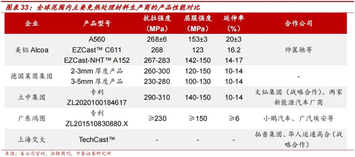 美国美铝是全球免热处理的领先者,国内厂商破风成长。国外免热处理材料厂商主要为美国美铝及德国莱茵金属集团。其中美国美铝在免热处理材料方面布局较早,取得一定的技术先发优势,其研发的EZCast-NHT™ A152系列产品在拉强度、屈服强度及延伸率方面具备较高的产品性能系数,并于帅翼驰合作将其产品带入中国市场。国内方面,立中集团、广东鸿图及上海交大是国内免热处理材料的先驱者。其中立中集团所研发的免热处理材料性能不输国外厂商,并与文灿集团达成战略合作关系,以及供货两家新能源车企厂商。