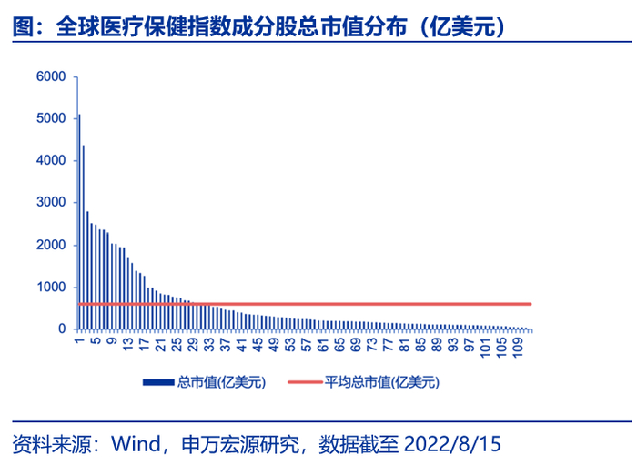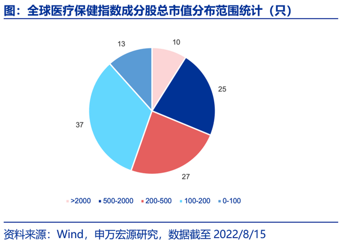 截止至2022年8月15日,全球医疗保健指数成分股共113只,平均总市值为603.84亿美元。从成分股总市值分布来看,有10只成分股总市值超过了2000亿美元,总市值介于500至2000亿美元的成分股有25只;总市值在200至500亿美元之间的成分股有27只;总市值在100至200亿美元之间的成分股有37只;其余13只成分股总市值在100亿美元以下。