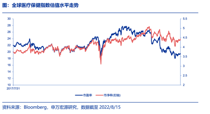 截止至2022年8月15日,全球医疗保健指数的市盈率为19.55倍,市净率为4.43倍,分别位于指数发布以来的5.41百分位和74.47百分位。当前指数市盈率估值已处于历史较低水平。