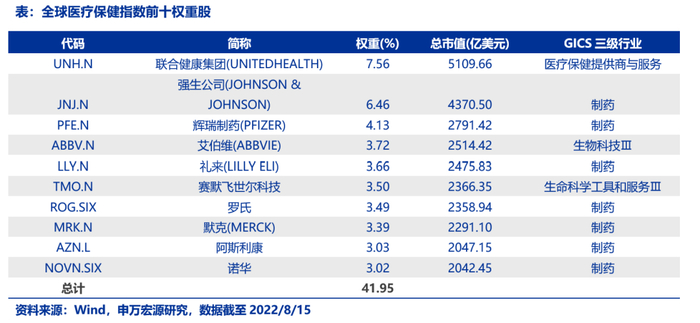 全球医疗保健指数前十大成分股权重合计为41.95%,权重排名前三的股票分别为联合健康集团、强生公司和辉瑞制药,权重分别为7.56%、6.46%、4.13%。前十大权重股共涉及4个GICS三级行业,其中制药行业独占7只权重股,剩余3只前十大权重股分别属于医疗保健提供商与服务、生物科技以及生命科学工具和服务行业。
