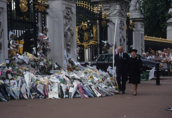 1997年9月6日,英国女王伊丽莎白二世和菲利普亲王走过向戴安娜王妃致敬的公众。8月31日,戴安娜王妃在车祸中丧生。