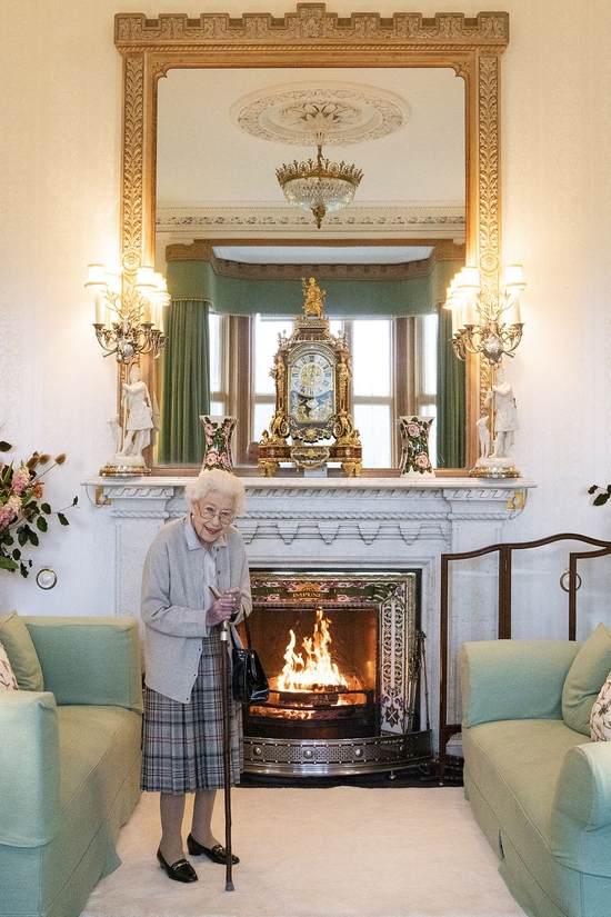 2022年9月6日,伊丽莎白女王在苏格兰巴尔莫勒尔堡微笑着等待伊丽莎白·特拉斯,即将任命她为英国新任首相。