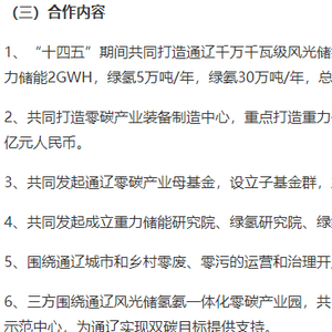 此外,共同发起成立重力储能研究院、绿氢研究院、绿氨研究院、生物质能研究院。三方围绕通辽风光储氢氨一体化零碳产业园,共同推动打造通辽市双碳数据管理和监测平台等。