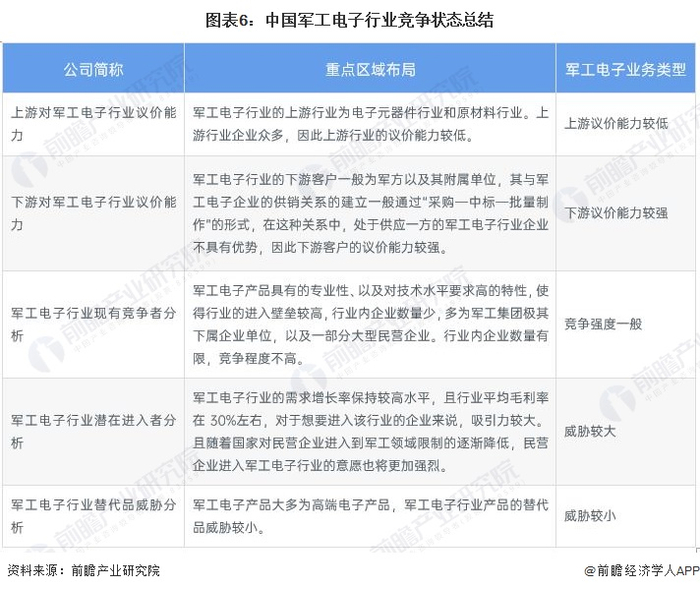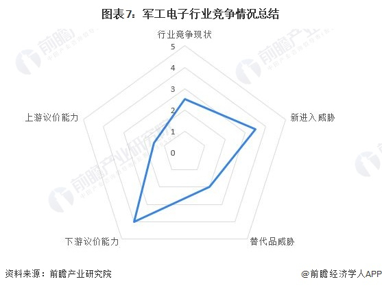 从五力竞争模型角度分析,由于军工行业的特殊性,军工电子行业内企业较少,竞争一般激烈;上游供应商一般为军工电子元件,公司众多供给充足,因此上游议价能力较低;军工电子行业下游为军方及其附属单位,由于多为合同制,所以下游议价能力较强;由于行业利润较高,且门槛逐步开放,因此行业潜在者进入威胁较小;同时,行业替代品尚不成熟,行业替代品威胁较小。