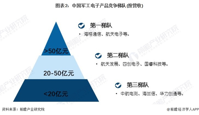 根据我国军工电子行业企业在军工电子产品方面的业务收入水平,可大致将其分为三个竞争梯队。第一梯队的企业军工电子产品营业收入在50亿元以上,代表企业包括海格通信、航天电子等。第二梯队的企业军工电子产品营业收入在20-50亿元之间,代表企业包括航天发展、四创电子、国睿科技等。第三梯队的企业军工电子产品营业收入在20亿元以下,代表企业包括中航电测、海兰信、华力创通等。具体竞争梯队如下: