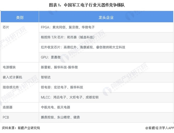 我国军工电子元器件行业细分领域较多,产品较多。其中集成电路细分行业的龙头企业有紫光国微、睿创微纳、和而泰;电源模块的龙头企业有新雷能、振华科技-振华微;嵌入式计算机的企业多为国企,民企的龙头代表为智明达;钽电容的龙头企业为宏远电子和振华科技,营收均在5亿元以上,MLCC的龙头企业为鸿远电子、火炬电子、成都宏明,市场占有率超过70%;连接器的代表性企业为中航光电、航天电器,市场占有率在50%以上。PCB的代表性企业有鹏鼎控股、东山精密、健鼎,市场占有率在26%左右。