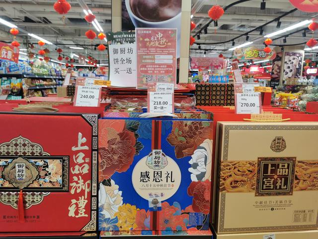 北京一家永辉超市销售的御厨坊系列月饼礼盒,售价在218元-498元,且临近中秋打出“全场买一赠一”促销活动。 新京报首席记者 郭铁 摄