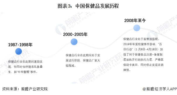 中国保健品行业发展起始于二十世纪80年代,改革开放之后,国民经济水平快速上升,人们对于保健品的需求有所上升。我国保健品行业发展历程可以划分为三个阶段:
