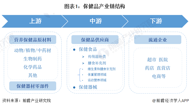 在国内,保健品是保健食品的通俗说法,根据中国保健协会的定义,保健食品是具有特定保健功能或者以补充维生素、矿物质为目的的食品,即适宜于特定人群食用,具有机体调节功能,不以治疗疾病为目的,并且对人体不产生任何急性、亚急性或者慢性危害的食品。由定义可以看出,保健品是特殊的食品,具有功能性,扮演人们日常生活食品的补充角色。中国保健品产业链较为成熟,主要包括上游原材料、中游供应厂商和下游流通企业。
