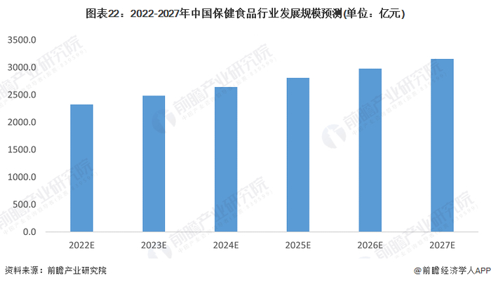 未来中国保健食品市场在各个年龄层级、各个市场层级,都存在着巨大的机会,随着国家人均GDP的提升,消费者在保健食品消费理念和消费意愿上都发生了根本性的转变,保健食品在消费属性上将逐渐从可选消费品向必选消费品转变。根据Euromonitor提供的数据,中国保健食品市场规模预计在2022年达到2324.7亿元,至2027年达到3158.2亿元。