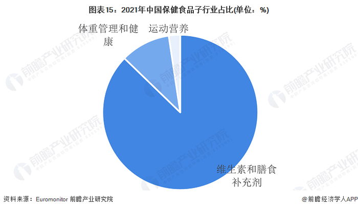 从细分市场占比来看,维生素和膳食补充剂在国内占主导地位,2021年市场规模占比为87.3%。体重管理领域的产品针对瘦身节食人群,潜在消费需求不容小觑。运动营养领域的保健食品主要针对健身和经常运动的人群,占比虽小但增速较快。
