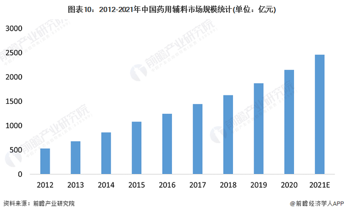 目前,国外药用辅料占整个药品制剂产值的10%-20%,由于我国药用辅料起步较晚,整体水平还较低,因此国内药用辅料在整个药品中占比还较低,一般认为在3%-5%左右(药用辅料主要用于化学药品制剂、生物生化制品和中成药等制剂产品)。根据近几年中国药品制剂产值计算药用辅料市场规模,初步核算2021年达到2462亿元。