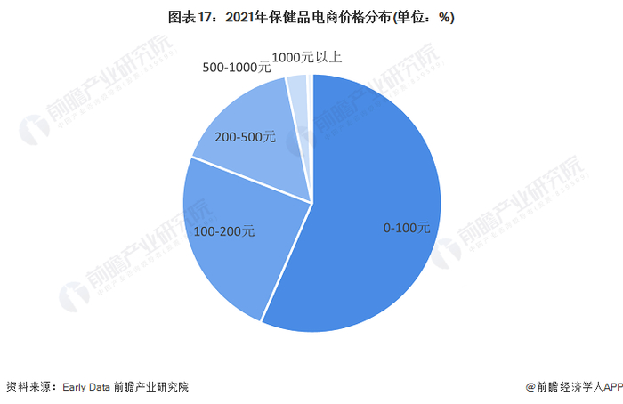Early Data电商大数据监测平台Data Compass数据显示,2021年,电商保健品(营养保健+母婴保健)销售额达754亿元,同比增长21.3%;销量达5.41亿,同比增长21.1%,市场增长势头强劲。机构统计的电商平台覆盖淘宝、天猫、天猫国际、京东、京东全球购、唯品会、拼多多、网易考拉、苏宁、亚马逊等。从价格段来看,2021年保健品电商市场中,0-100元的商品占比最大,超过了50%,而尽管均价500元以上的商品销量市场份额仅为3.3%,但销售额同比增速亮眼。
